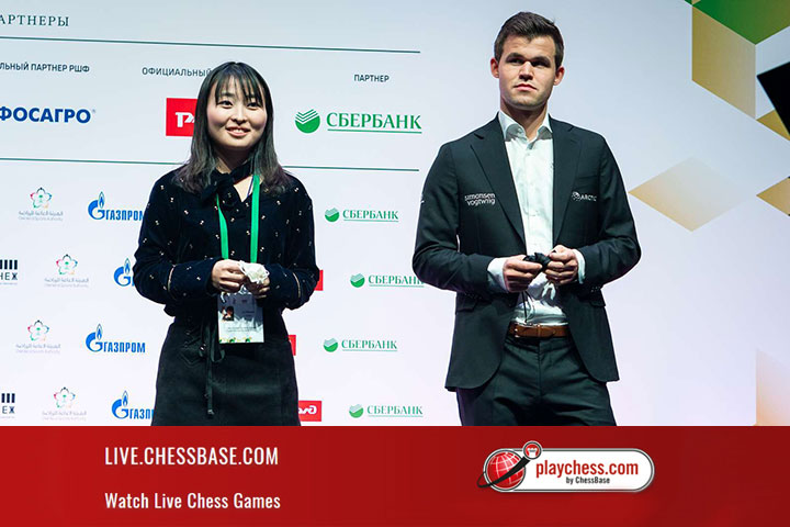 | Ju Wenjun e Carlsen durante a Cerimônia de Abertura |